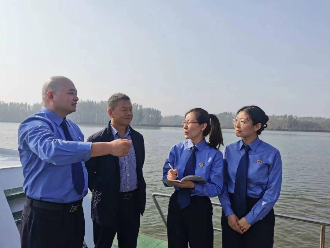 邳州市检察院公益诉讼检察官刘宝华(左一)和同事们一起与当地乡镇工作人员查看大运河生态保护情况。