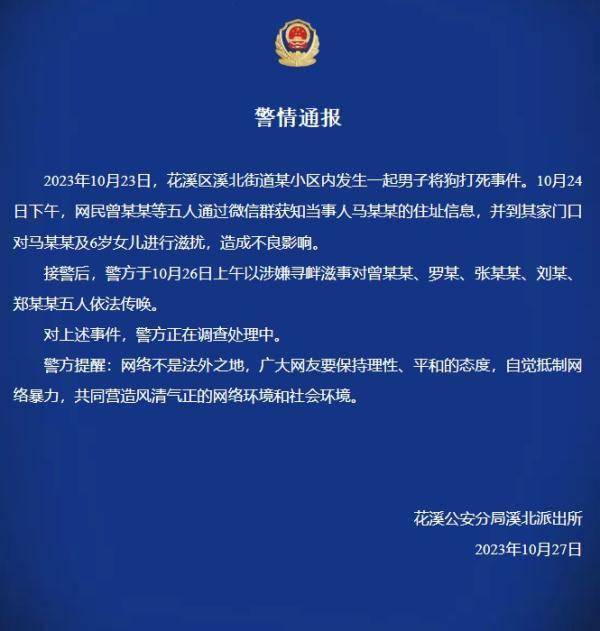 通报称,10月23日,花溪区溪北街道某小区内发生一起男子将狗打死事件。10月24日下午,网民曾某某等五人通过微信群获知当事人马某某的住址信息,并到其家门口对马某某及6岁女儿进行滋扰,造成不良影响。