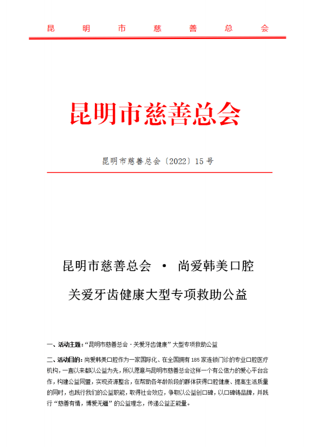 5.注意事项:报名后,昆明市慈善总会公益小组会在24小时内与您联系,核实相关信息,告知相关细则。因昆明市慈善总会不具备诊疗资质,特通过严格的考察筛选,将韩美口腔选定为“口腔定点救助机构”,广大市民放心就诊,尽早找回牙健康,双方积极接受市民的监督。特此筛序出相关技术实力雄厚的医生团队为市民亲诊开通绿色就诊通道。