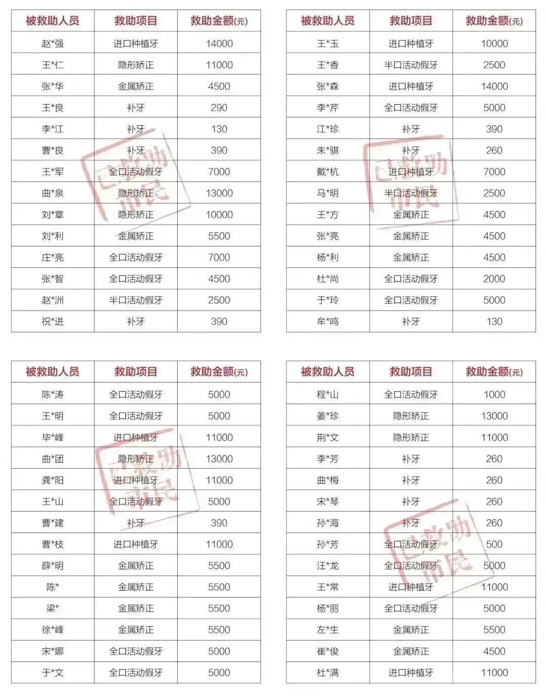 2.常规报销:挂号费、专家诊疗费、方案设计费、数字全景片检查、3D数字影像CT等费用全额救助补贴,即全部免费。