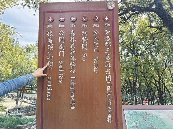 继续前行,记者来到另一处导览图前。导览图右侧立着一面高高的指路牌,路牌显示,下行450米是牡丹园,向右350米是彩叶坪,左行250米为行龙谷,700米为公园南门,又一个向下的箭头显示1000米处为狼坡顶。指向还算细致,可因为在导览图上仍然找不到“您现在所在位置”,现场10余名游客均无法确定自己所处方位。