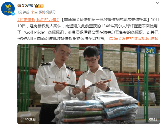 10月19日,经商标权利人确认,南通海关此前查获的1346件高尔夫球杆握把表面使用了“Golf Pride”商标标识,涉嫌侵犯伊顿公司在海关总署备案的商标权。该关已根据权利人申请对该批涉嫌侵权货物依法予以扣留。