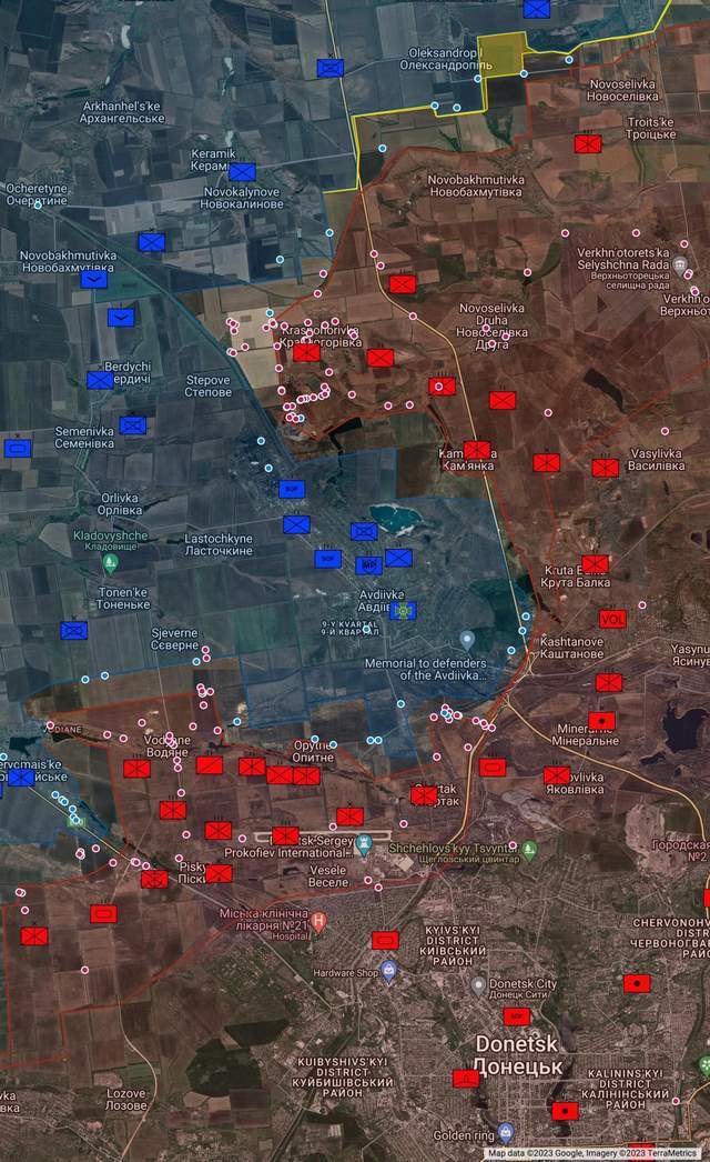 然而,如果按照乌军将城内守军增加至3万人的计划,为了确保守军能够在俄军包围下守住补给通道,乌军至少要在奥切列季涅(Очеретине)至佩尔沃迈斯基镇(Первомайське)一线的外围防区投入至少10万人的部队,也就是说,在阿瓦迪夫卡乌军要想守住,至少要维持年初巴赫穆特战役的兵力投入,这对于当前的乌军来说无异于一场噩梦。