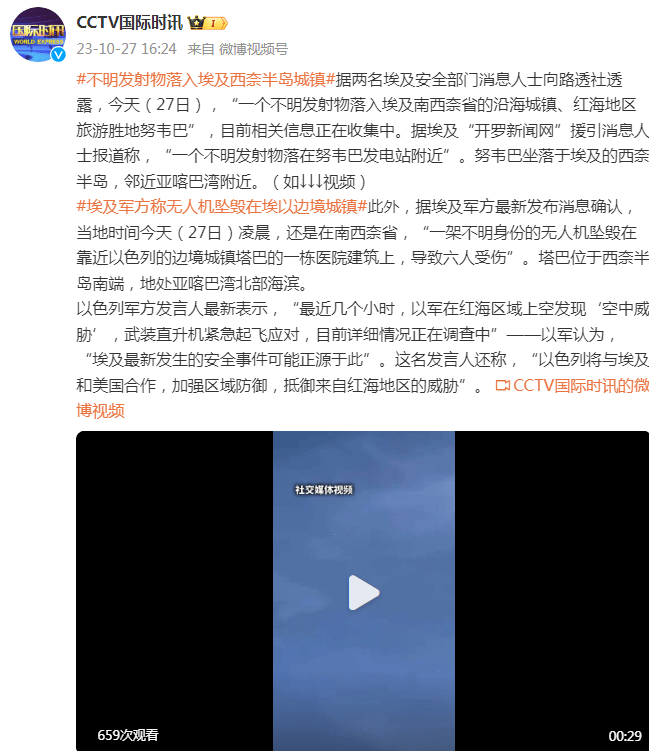 此外,据埃及军方最新发布消息确认,当地时间今天(27日)凌晨,还是在南西奈省,“一架不明身份的无人机坠毁在靠近以色列的边境城镇塔巴的一栋医院建筑上,导致六人受伤”。塔巴位于西奈半岛南端,地处亚喀巴湾北部海滨。
