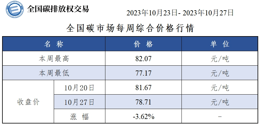 上证报中国证券网讯 据上海环境能源交易所消息,本周全国碳市场综合价格行情为:最高价82.07元/吨,最低价77.17元/吨,收盘价较上周五下跌3.62%。