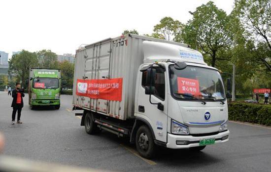 七辆满载爱心物资的货车正式发车。受访单位供图