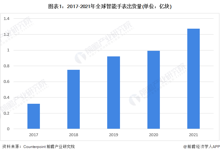 自2017年以来,随着智能手表功能的不断丰富和价格的逐渐下降,全球智能手表的出货量呈现出显著增长的趋势。从2017年的0.32亿块增长至2021年的1.275亿块,年均复合增长率达到了41.28%。