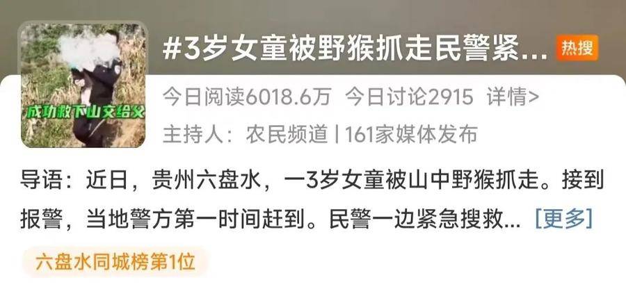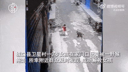2022年4月19日,重庆龙田乡卫星村一名3岁女孩在家门口玩耍时,险些被一只猴子拖走。幸亏附近一位热心人大叫并追赶猴子,才将女孩救下。