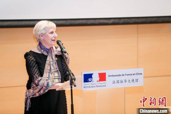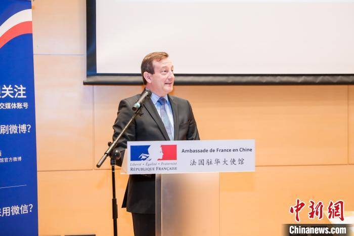 图为法国驻华大使白玉堂在新闻发布会现场致辞。法国驻华大使馆 供图