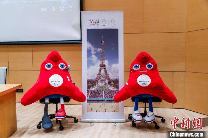 图为2024年巴黎奥运会和残奥会吉祥物弗里吉(Phryge)在新闻发布会现场。法国驻华大使馆供图