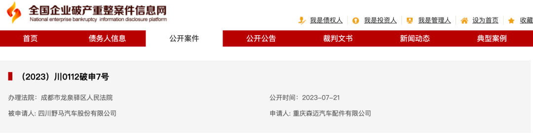 这是野马汽车再次被申请破产审查。7月21日,四川野马汽车股份有限公司(下称“野马汽车”)新增破产审查案件,申请人为成都金固车轮有限公司,经办法院为成都市龙泉驿区人民法院。此前,7月21日,野马汽车新增破产审查案件,申请人为重庆森迈汽车配件有限公司,经办法院为成都市龙泉驿区人民法院。