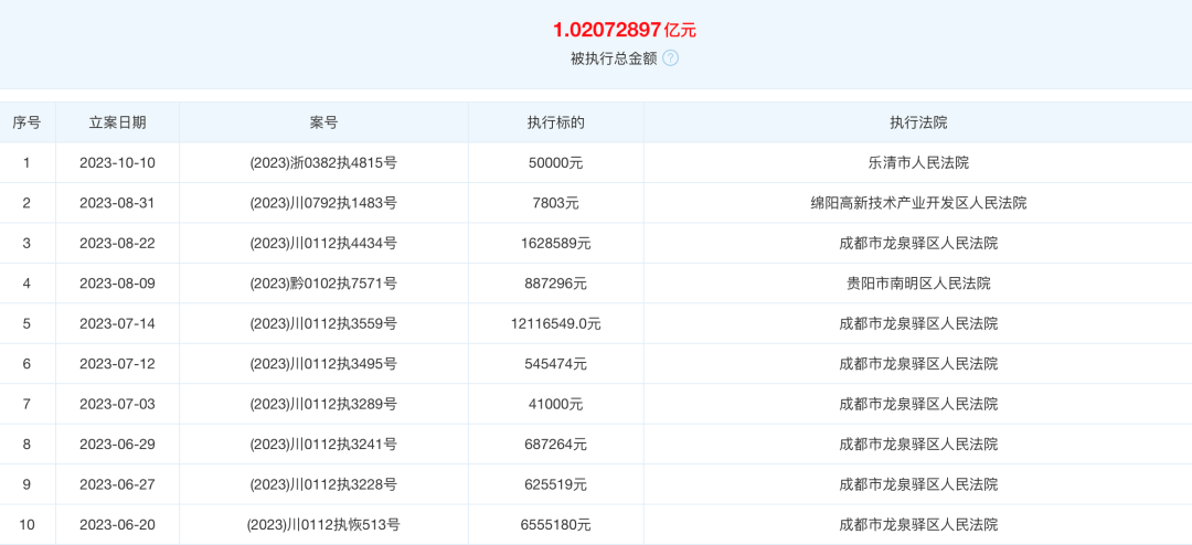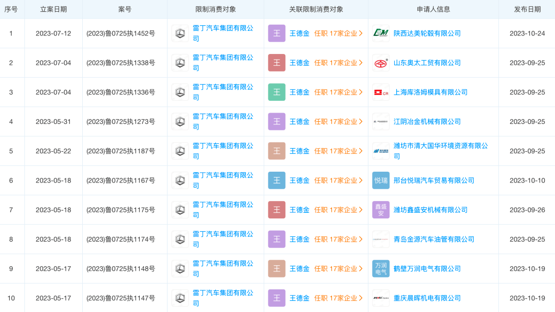 5月16日,因有履行能力而拒不履行生效法律文书确定义务,雷丁汽车被缙云县人民法院列为失信被执行人(老赖)。5月23日,雷丁汽车新增被执行人信息,执行标的653万余元,执行法院为昌乐县人民法院。7月17日,雷丁汽车新增一则股权冻结信息,被执行人为四川野马汽车股份有限公司,冻结股权数额25.74亿元,冻结期限自2023年7月17日至2026年7月16日,执行法院为山东省昌乐县人民法院。10月7日,雷丁汽车新增4则被执行人信息,执行标的2892万余元,执行法院均为昌乐县人民法院。