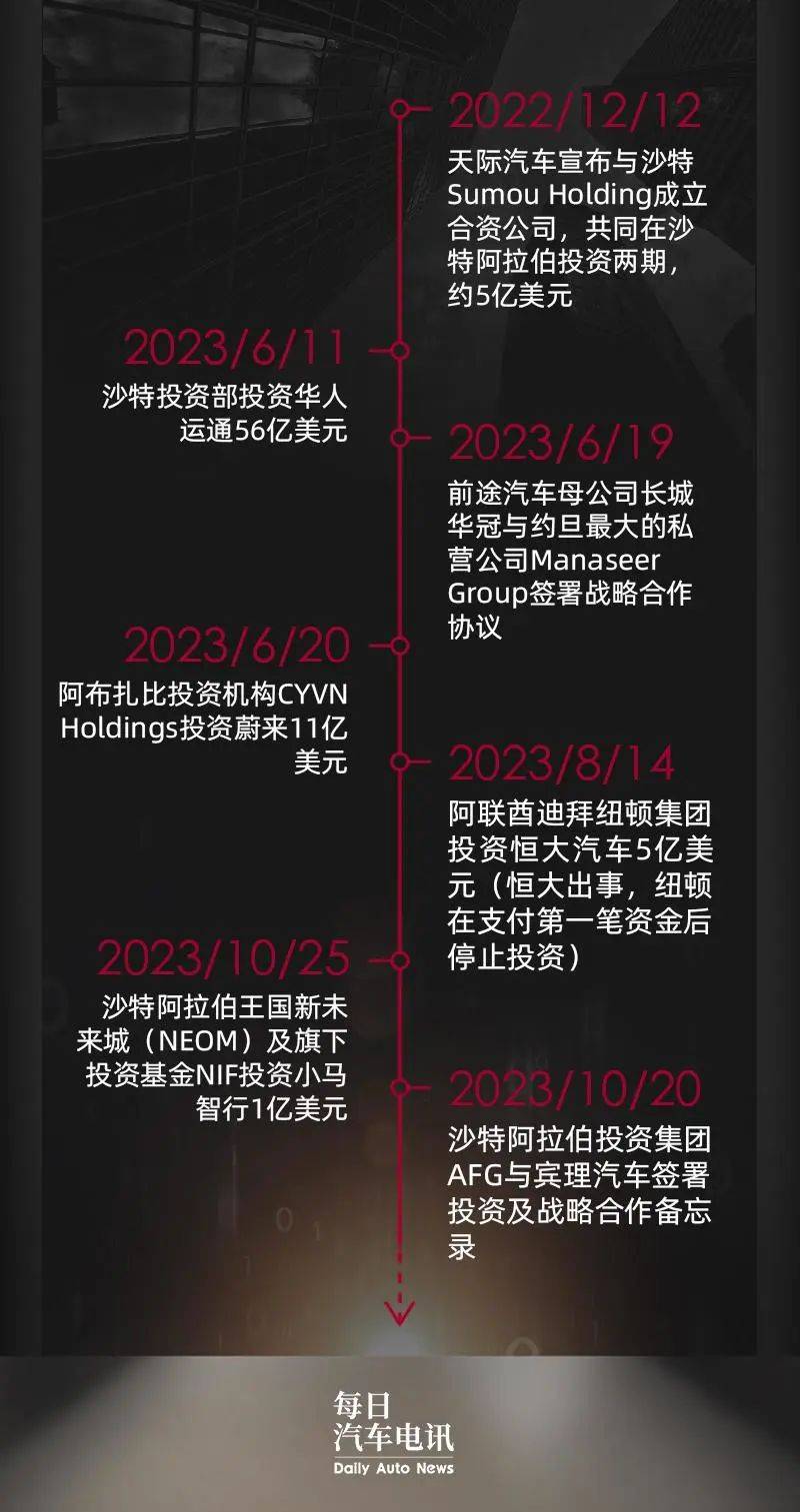 细数下来,除开高合,自去年12月天际宣布和沙特Sumou Holding成立合资公司以来,中东资本就密集对我国新能源和智能化公司进行投资。