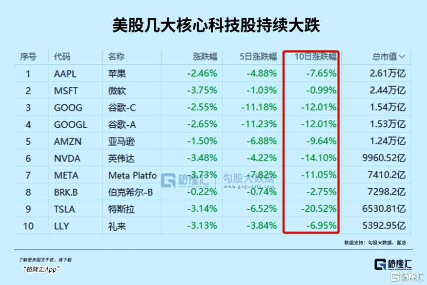 比如谷歌,业绩暴雷,一夜暴跌炒9%;英伟达、META股价近10日跌超10%,最差是特斯拉,甚至跌了20%。它们基本都是因为部分财报数据表现不及预期所导致,已经具有很大的代表性了。