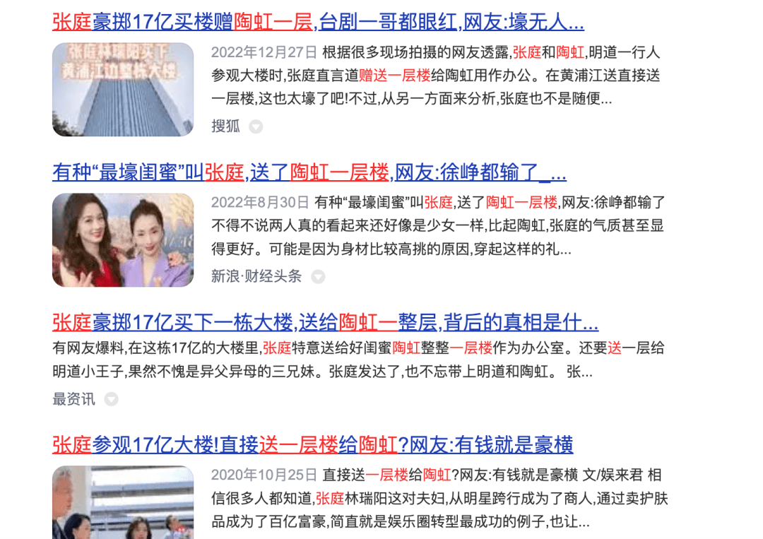 陶虹、徐峥在TST中的角色不仅仅是站台这么简单,TST的活动通稿中,一度以“好闺蜜张庭陶虹合伙从商”为标题;张庭自己也在微博中将TST形容成“我和陶虹的产品”。短视频平台同样充斥着类似内容:功成名就的张庭,豪掷17亿在黄浦江边买了一栋楼,随手送给闺蜜陶虹一层。