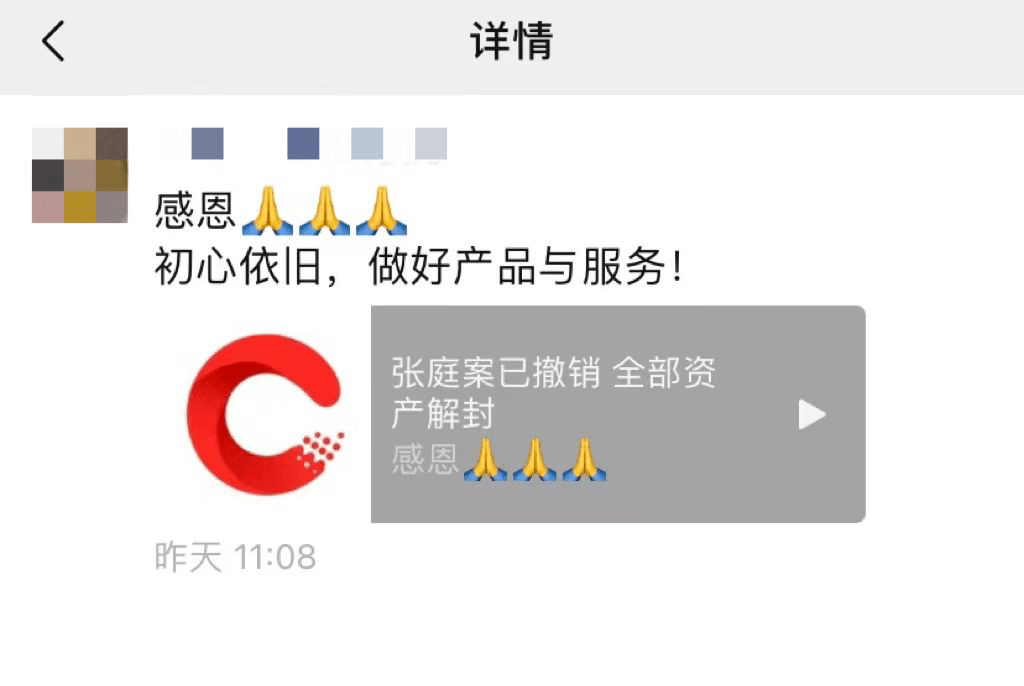 得知张庭案已撤销的消息后,上述工作人员在朋友圈转发了相关消息并配文:感恩,初心依旧,做好产品与服务。对他们来说,案件撤销显然是意料之外的好消息,张庭曾经建立微商帝国笼络起的百万“信徒”,正等待回家。