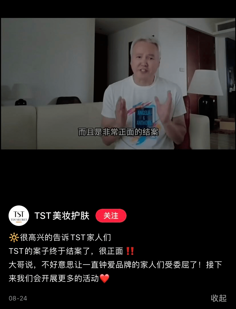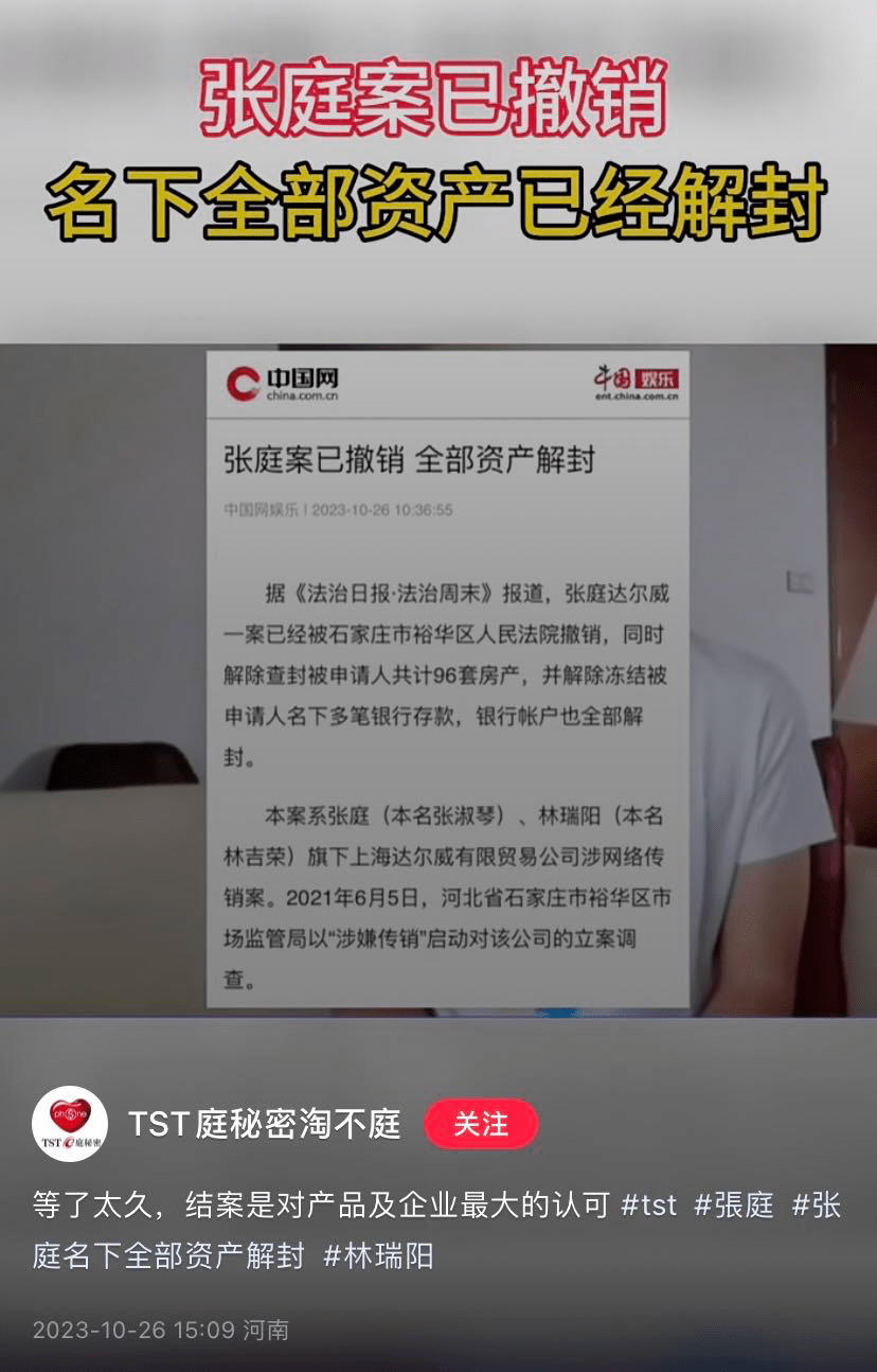 消息公布当日,张庭丈夫林瑞阳即在小红书发布短视频号召代理商们回家,“我们的案子终于结案了,而且是非常正面的结案”,视频中,林瑞阳摆了摆了手,“我们的产品,一点问题都没有。我们会在全球各地,重新找回我们的代理,TST是最好的。”