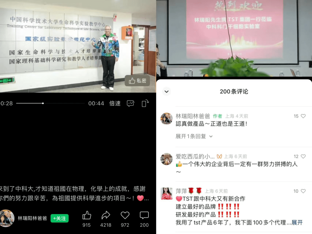 林瑞阳还配文称,认真做产品,正道也是王道。视频的评论区被TST“信徒”占领,“TST坚持走正道,值得信赖”“TST跟中科大又有新合作”“TST最强国货”“谣言止于智者,用事实说话”。