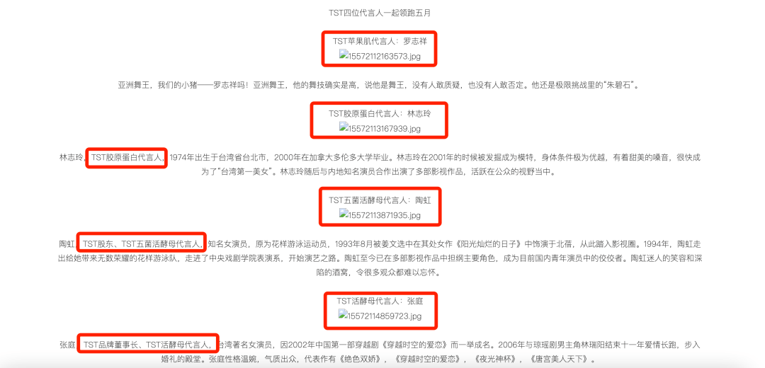 过去几年,为了扭转“微商”标签所带来的负面消息,张庭把自己的娱乐圈人脉关系运用得淋漓尽致。TST官微显示,林志玲、蒋依依、罗志祥曾为该品牌代言,徐峥还曾出任该品牌某产品线的形象大使。吴宗宪、李晨(主持人)、范逸臣、海泉等人曾公开参与TST举办的活动,张馨予、明道、刘涛等人都曾发微博为TST点赞。