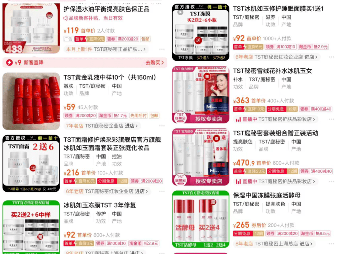 但在张庭消失的日子里,他们的“信徒”们依然坚守,期待他们的“大哥庭姐”早日回归。在电商平台,有众多带着“TST”字样的个人店铺和企业店铺仍旧存在,也仍有消费者在购买商品并写下评论,甚至还有个人账号在直播间售卖TST的商品。