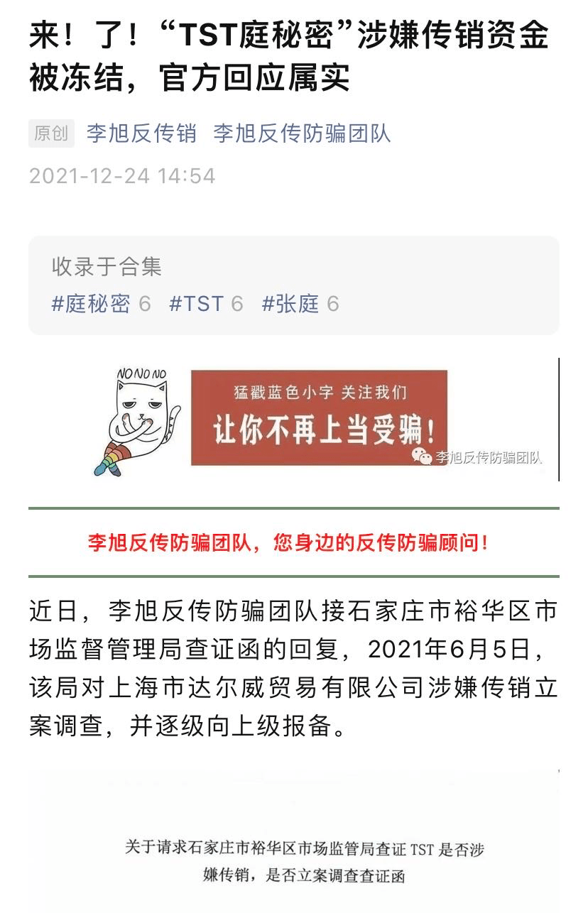 然而,就在2021年底,反传销机构“李旭反传防骗团队”的一篇发文将张庭和她的TST送上了风口浪尖,文章直指达尔威公司涉嫌利用网络从事传销活动。
