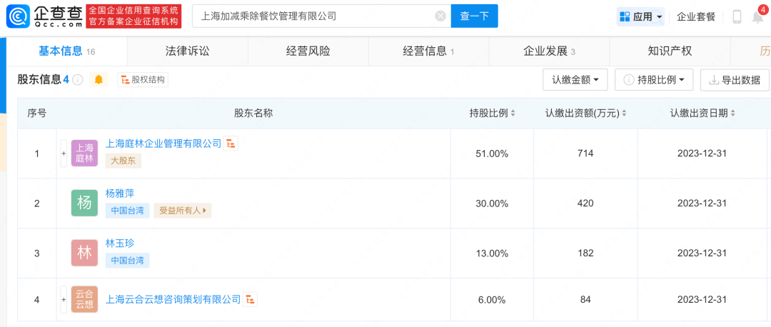 今年8月份,张庭夫妇还跨界餐饮业,投资成立餐饮公司,公司名为上海加减乘除餐饮管理有限公司,注册资本1400万人民币。