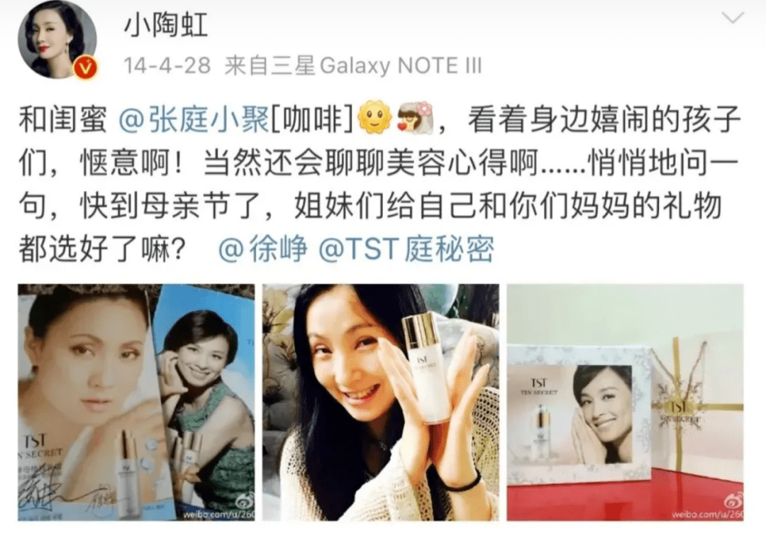 翻开陶虹微博,2014年4月28日,她开始宣传TST美容产品。2015年,陶虹、徐峥夫妇经常为张庭夫妇的TST庭秘密站台,出席活动。徐峥2015年宣传《港囧》的时候,还在综艺上cue到了TST的“囧膜”产品。