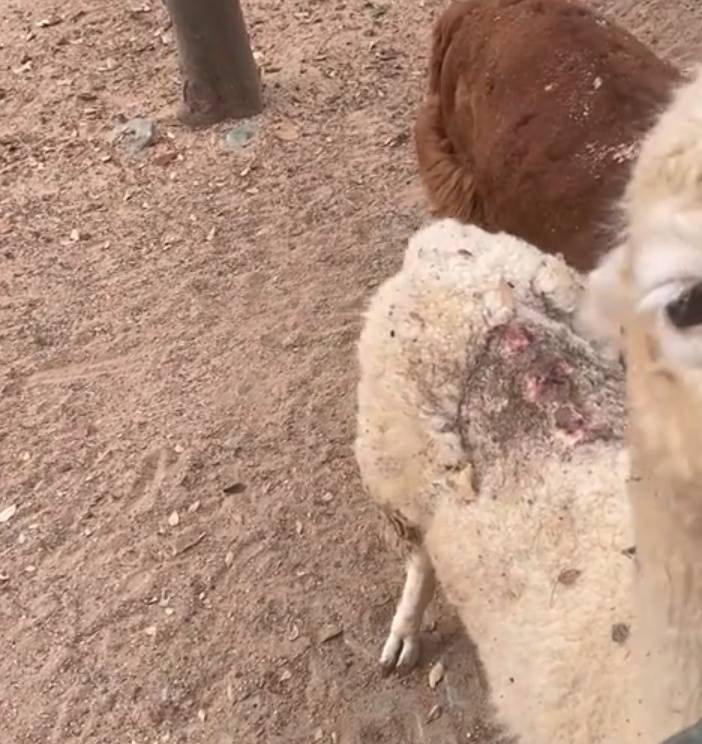 该工作人员表示:“羊驼现在还小,所以会跑出去跟其他羊驼玩,把伤口蹭脏了,所以看起来黑乎乎的,其实已经上药处理了,那块毛是给它剃掉了。现在已经重新包扎,给受伤的羊驼关起来了。”
