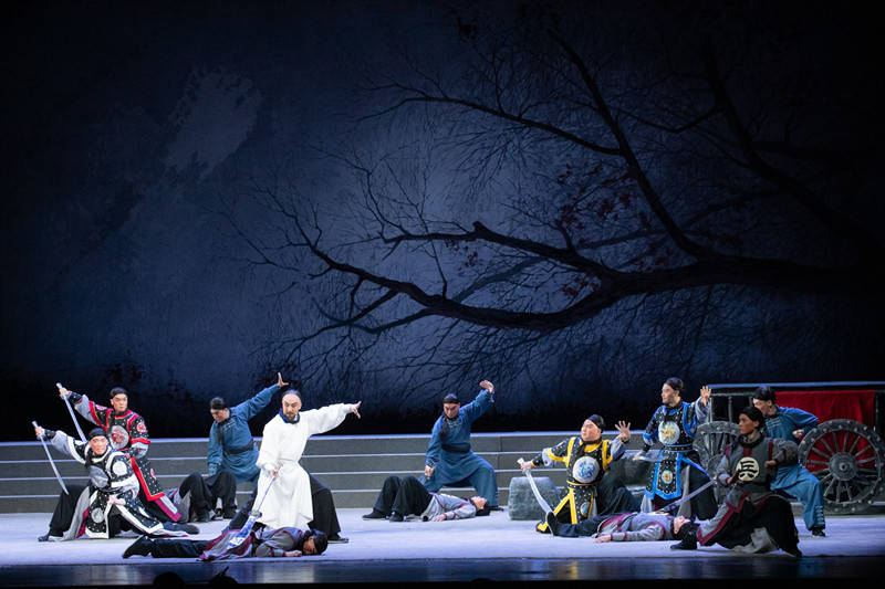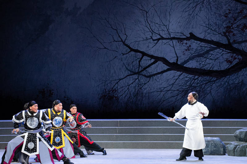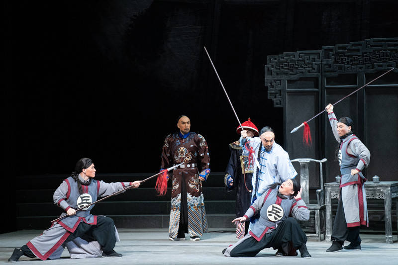 以饰演王五的詹磊为例。这出戏的声腔与一般的戏曲声腔有所不同,作曲家一开始便使用了【高拨子】。【高拨子】作为京剧中的一种腔调,其高亢之中见悲愤且较为紧张,开幕曲过后,一开场气氛就紧张起来,很好地烘托出王五营救安维峻的紧张气氛和焦急的心情。詹磊一上来就能够神足气完地唱好这段【高拨子】,足见其舞台以外所下的“文场”功夫,武生演员若能保证有一条好嗓子以及娴熟的演唱技巧是十分难得的。