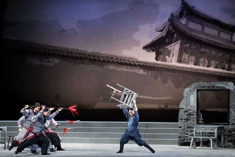 作为武戏,武打是必不可少的。这出戏也可谓是武打行当齐全、各种武戏技巧集大成者。更值得一提的是,整出戏的技术为叙事和人物服务,而不是为了廉价的喝彩声和舞台气氛而刻意设计高难度技术。熟悉京剧的观众可以从演员们的那些高难度动作中看到《挑华车》《雁荡山》《三盗九龙杯》等经典传统武戏的影子,但又全部“化”入到了《大刀王五》的情境之中。不管是“打出手”还是“下高”……种种高难度动作都符合戏理,但又别出心裁,真正体现了“武戏文唱而不温”的效果。