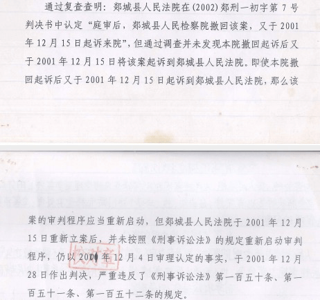 北京鑫诺律师事务所律师金鑫表示,根据两份《刑事裁定书》,可以确定本案于2001年11月12日在郯城县法院立案,案号为2001郯刑一初字第296号,根据《刑事申诉复查通知书》和两份《刑事裁定书》,可以确定本案于2001年12月4日开庭审理。尽管郯城县法院原审判决书认定本案“庭审后,郯城县人民检察院撤回该案,又于2001年12月15日起诉来院”,但《刑事申诉复查通知书》和两份《刑事裁定书》均确认检察机关并没有撤回起诉。两份《刑事裁定书》确认本案又于2001年12月15日重新立案,案号为(2002)郯刑一初字第7号。