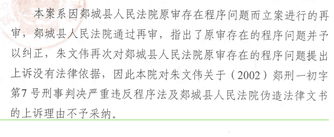 2012年1月6日,临沂市中级人民法院作出《刑事裁定书》指出,郯城县人民法院通过再审,指出了原审存在的程序问题并予以纠正,朱文伟再次对郯城县人民法院原审存在的程序问题提出上诉没有法律依据,因此本院对朱文伟关于(2002)郯刑一初字第7号刑事判决严重违反程序法及郯城县人民法院伪造法律文书的上诉理由不予采纳。