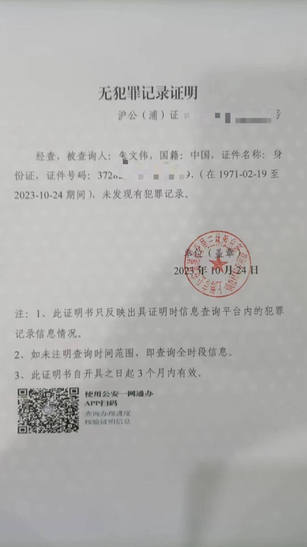 随后几年朱文伟一直在上海打工谋生,但他始终认为判决自己14年有期徒刑的判决书有疑问。在他印象中,警方查过他的身份证,好像没有犯罪记录。为了再次验证,今年10月24日,朱文伟在日常居住地辖区派出所上海市公安局浦东分局三林派出所开出了《无犯罪记录证明》,该证明显示,朱文伟从出生的1971年2月19日到2023年10月24日,未发现犯罪记录。