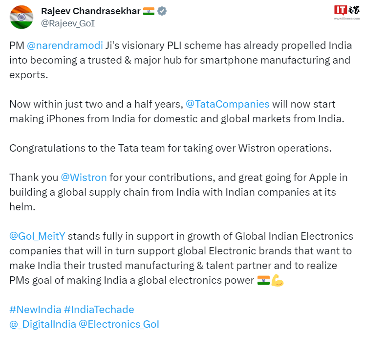 印度信息技术部副部长 Rajeev Chandrasekhar 在 X(推特)上发文表示,塔塔公司将开始在印度生产 iPhone,供应国内和全球市场。