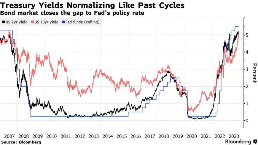 四面楚歌的债券投资者们在权衡全球最大规模债券市场的风险与回报比例时,纷纷拥抱接近5%的10年期美国国债收益率。有着“全球资产定价之锚”称号的10年期美债收益率今年下半年以来持续上行,在本周一度攀升至2007年以来的最高点,一度超过5%,使得债券多头们损失惨重,但是交易员们在几十年来最严重的美债熊市中寻找到一线希望——即较高的固定收益率为投资组合提供了更大的保护力度。