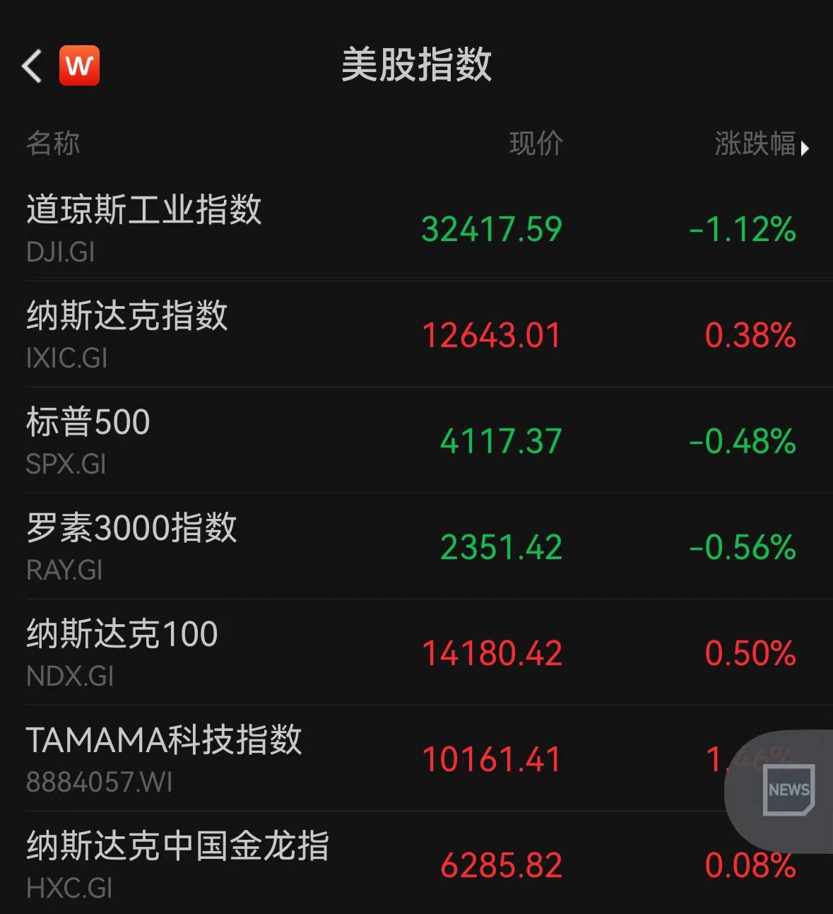 截至收盘,道指跌1.12%报32417.59点;标普500指数跌0.48%报4117.37点,较7月31日所创收盘历史新高回调超10.27%;纳指涨0.38%报12643.01点。本周,道指跌2.14%,标普500指数跌2.53%,纳指跌2.62%。