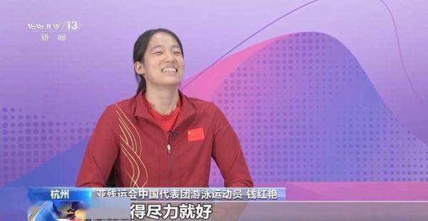 亚残运会中国代表团游泳运动员 钱红艳:我觉得尽力就好,因为我在水里面的感觉就很自由,我很喜欢和队友之间大家一起拼搏的那种感受,我还是会一直坚持的。
