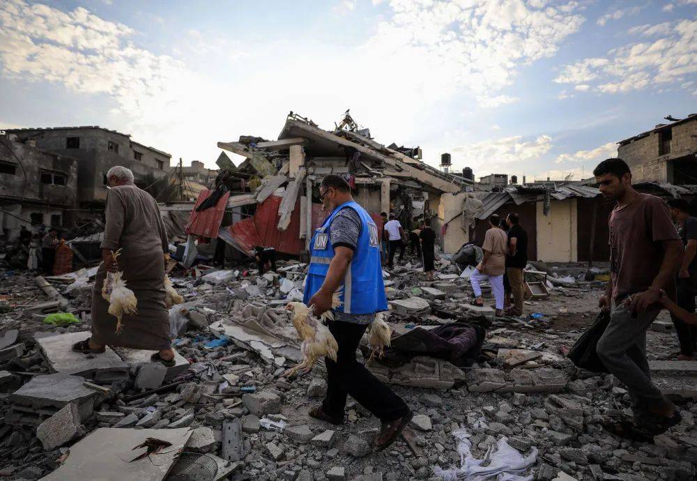 △10月27日,在加沙地带南部城市汗尤尼斯,人们经过以军袭击后的房屋废墟。新华社发(亚西尔·库迪摄)