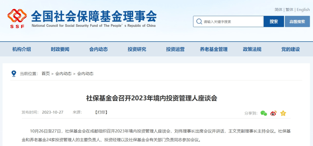 10月26日至27日,社保基金会在成都组织召开2023年境内投资管理人座谈会,刘伟理事长出席会议并讲话,王文灵副理事长主持会议。社保基金和养老基金24家投资管理人的主要负责人、投资经理以及社保基金会有关部门负责同志参加会议。