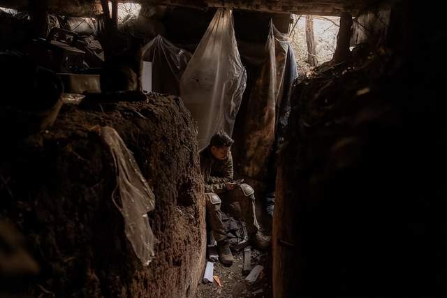 (躲在战壕里的乌军士兵)