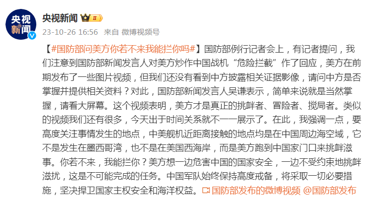 对此,国防部新闻发言人吴谦表示,简单来说就是当然掌握,请看大屏幕。这个视频表明,美方才是真正的挑衅者、冒险者、搅局者。类似的视频我们还有很多,今天出于时间关系就不一一展示了。在此,我强调一点,要高度关注事情发生的地点,中美舰机近距离接触的地点均是在中国周边海空域,它不是发生在墨西哥湾,也不是在美国西海岸,而是美方跑到中国家门口来挑衅滋事。你若不来,我能拦你?美方想一边危害中国的国家安全,一边不受约束地挑衅滋扰,这是不可能完成的任务。中国军队始终保持高度戒备,将采取一切必要措施,坚决捍卫国家主权安全和海洋权益。