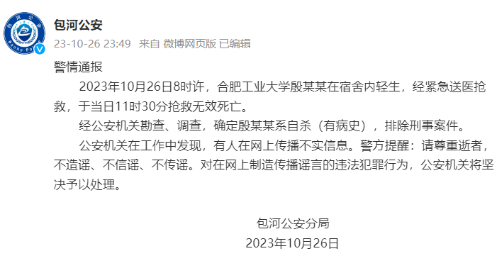 26日晚,微博@包河公安发布警情通报,2023年10月26日8时许,合肥工业大学殷某某在宿舍内轻生,经紧急送医抢救,于当日11时30分抢救无效死亡。