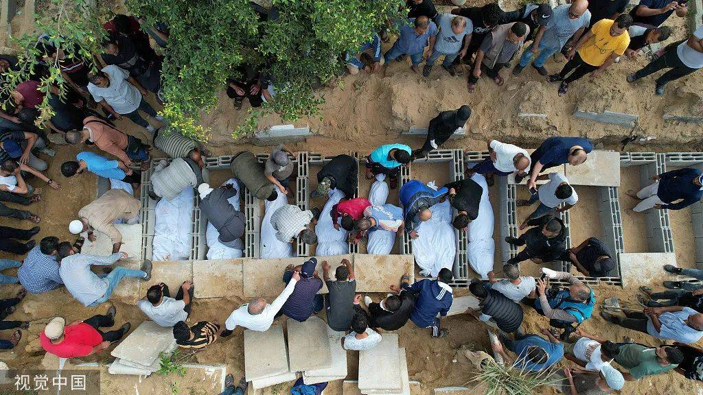 当地时间10月23日,加沙地带,空袭幸存者安葬遇难的亲人。图片来源:视觉中国