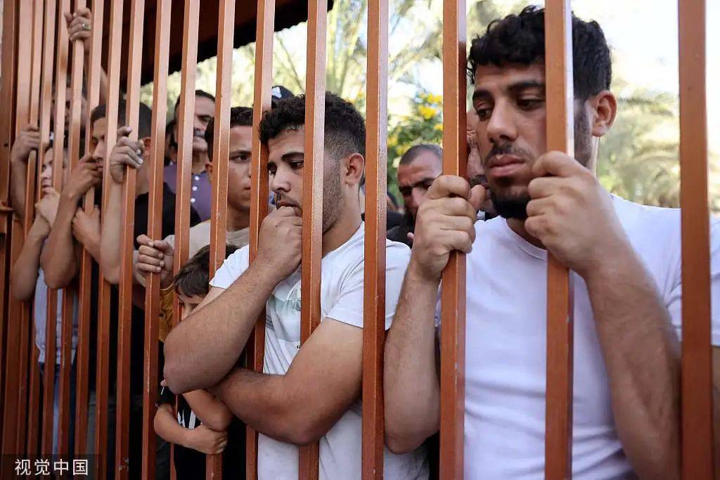 当地时间10月26日,巴勒斯坦汗尤尼斯,巴勒斯坦人在纳赛尔医院外等待他们在以色列空袭中丧生的亲人的尸体。图片来源:视觉中国