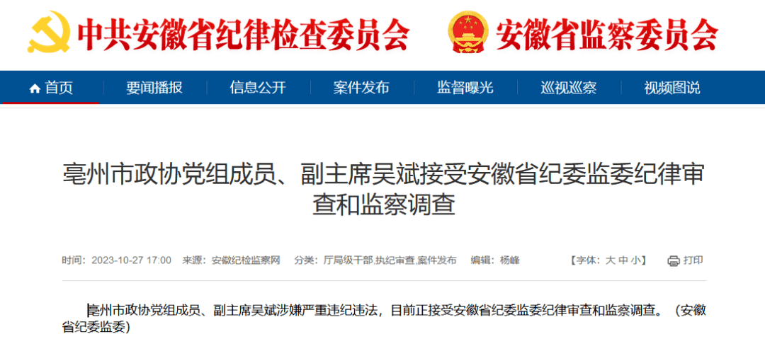 亳州市政协党组成员、副主席吴斌涉嫌严重违纪违法,目前正接受安徽省纪委监委纪律审查和监察调查。(安徽省纪委监委)