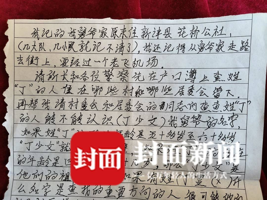 信中范贤生提到其1974年从四川隆昌县石碾公社八大队五队,来过新津花桥公社舅舅和舅妈家中探亲,仅记得当时舅舅名字:丁少文(音),其中一个表兄叫丁显×,具体居住地址也记不清,只记得从舅舅家到花桥街上需要经过一个老飞机场。
