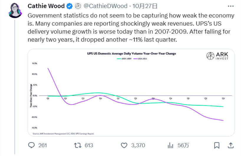 对此,方舟投资管理公司创始人“木头姐”Cathie Wood在社媒平台“X”上表示,“美国政府统计数据似乎并没有反映出经济的疲软程度。许多公司都公布了令人震惊的疲软收入。联合包裹目前在美国的快递量增长不如2007-2009年。在连跌近两年之后,上个季度又下跌了约11%。”