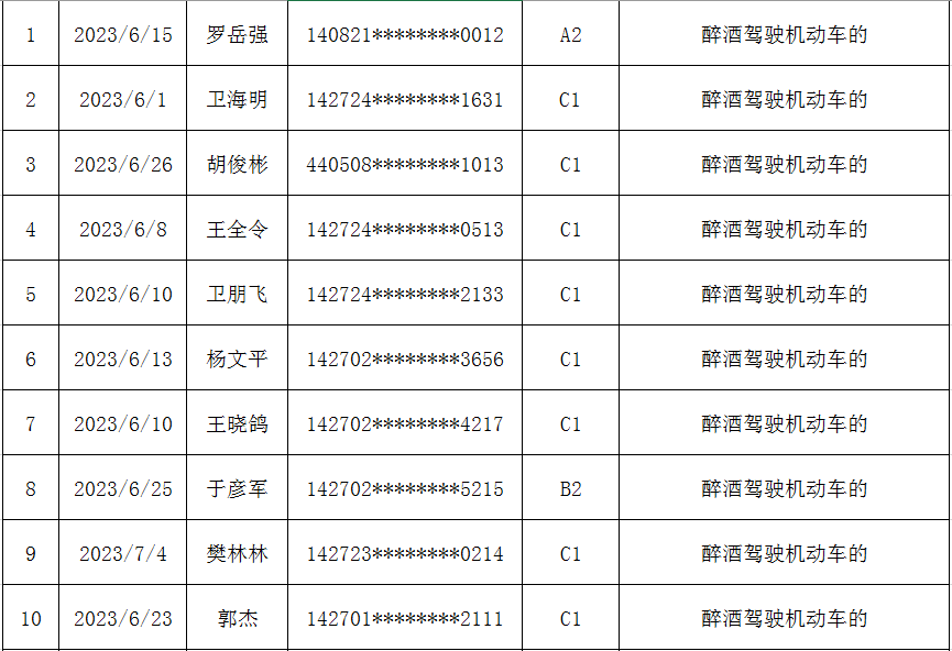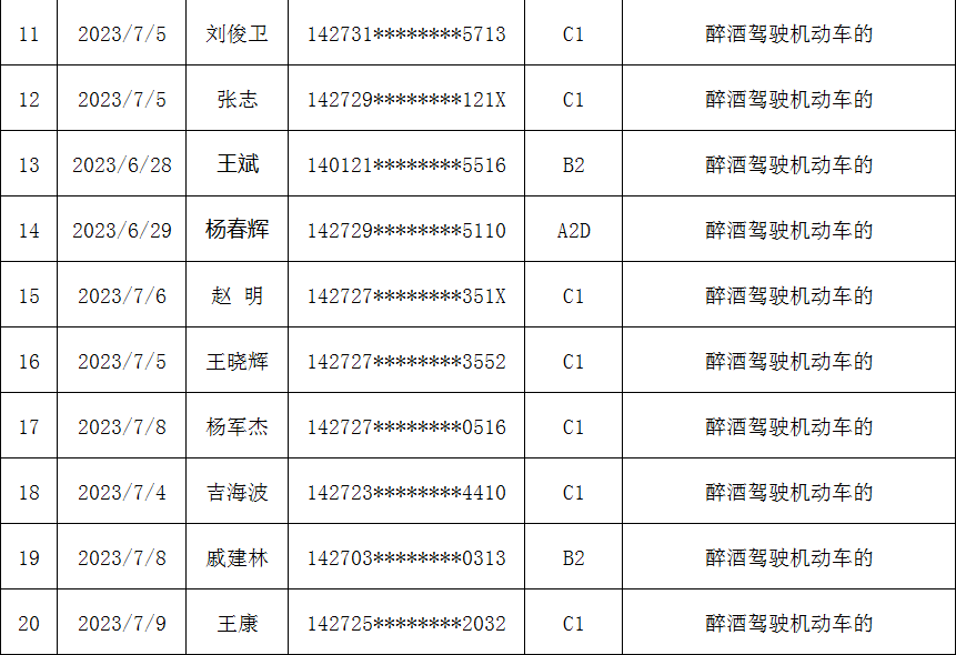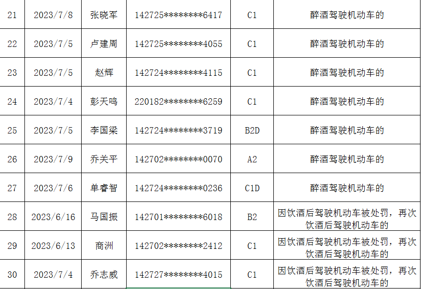 2023年,为有效惩治严重交通违法行为,大力维护良好的道路交通秩序,确保人民群众出行安全,运城交警不断加大对各类严重交通违法行为的查处和打击力度,依法对醉驾、驾驶报废车、拼装车、涉嫌交通肇事罪等严重交通违法行为的当事人做出吊销机动车驾驶证或者终身禁驾的处罚,被吊销机动车驾驶证的32人进行曝光,希望广大驾驶人引以为戒,牢记安全,守法驾驶。