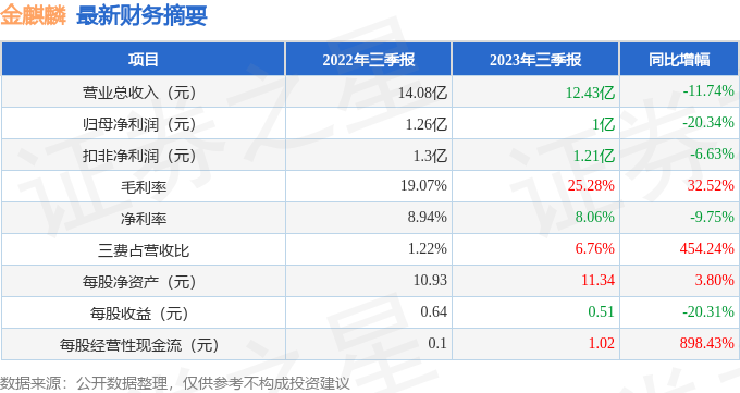 据证券之星公开数据整理,近期金麒麟(603586)发布2023年三季报。根据财报显示,本报告期中金麒麟净利润减20.34%,三费占比上升明显。截至本报告期末,公司营业总收入12.43亿元,同比下降11.74%,归母净利润1.0亿元,同比下降20.34%。按单季度数据看,第三季度营业总收入3.61亿元,同比下降27.45%,第三季度归母净利润1406.44万元,同比下降75.01%。