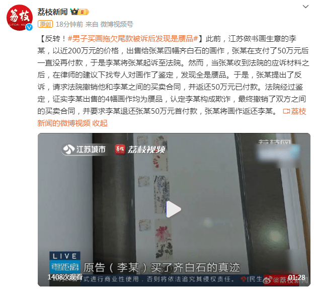 原标题:反转!男子买画拖欠尾款被诉后发现是赝品